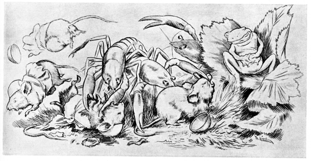 Ti offriamo una riproduzione artigianale su tela dell'opera famosa 'Krigen Mellom Froskene Og Musene 13' di Theodor Severin Kittelsen, dal Museo delle Riproduzioni.