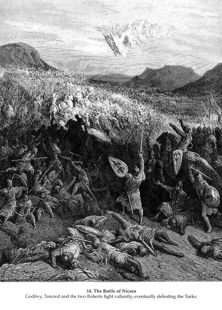 Ti offriamo una riproduzione artigianale su tela dell'opera famosa 'La battaglia di Nicea nel 1097' di Gustave Dore, dal Museo delle Riproduzioni.