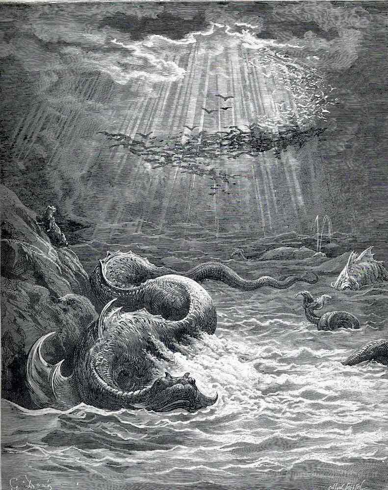 Ti offriamo una riproduzione artigianale su tela dell'opera famosa 'La creazione di pesci e uccelli' di Gustave Dore, dal Museo delle Riproduzioni.