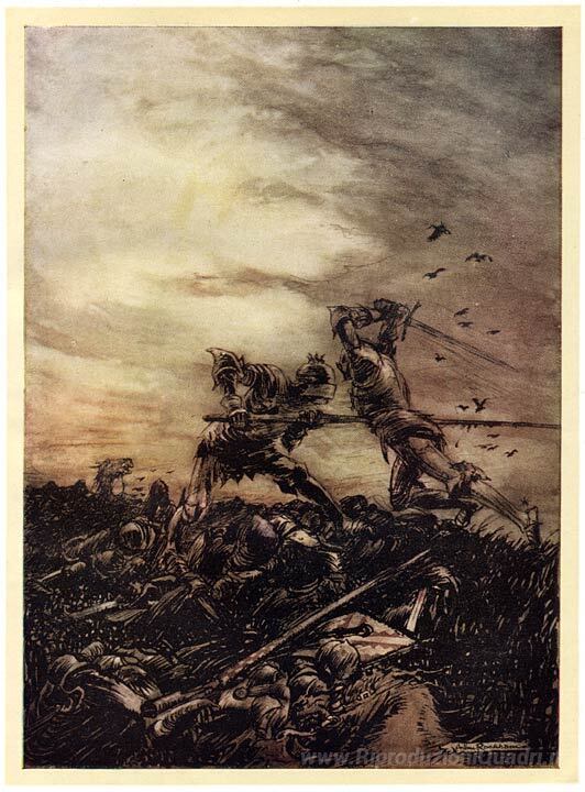 Ti offriamo una riproduzione artigianale su tela dell'opera famosa 'La lotta tra Re Artù e Modred' di Arthur Rackham, dal Museo delle Riproduzioni.