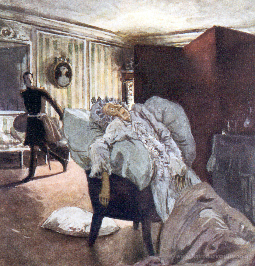 Ti offriamo una riproduzione artigianale su tela dell'opera famosa 'La morte della Contessa' di Alexandre Benois, dal Museo delle Riproduzioni.
