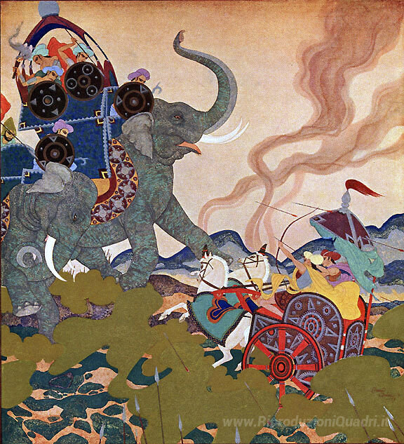 Ti offriamo una riproduzione artigianale su tela dell'opera famosa 'La Perla del Guerriero, da Il Regno dei Pearl' di Edmund Dulac, dal Museo delle Riproduzioni.