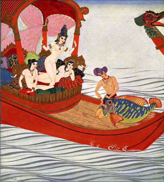 Ti offriamo una riproduzione artigianale su tela dell'opera famosa 'La Perla del pesce, da Il Regno dei Pearl' di Edmund Dulac, dal Museo delle Riproduzioni.