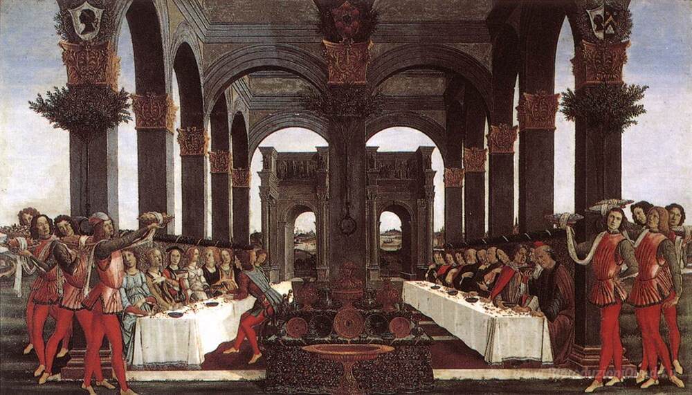 Ti offriamo una riproduzione artigianale su tela dell'opera famosa 'La Storia di Nastagio degli Onesti' di Sandro Botticelli, dal Museo delle Riproduzioni.