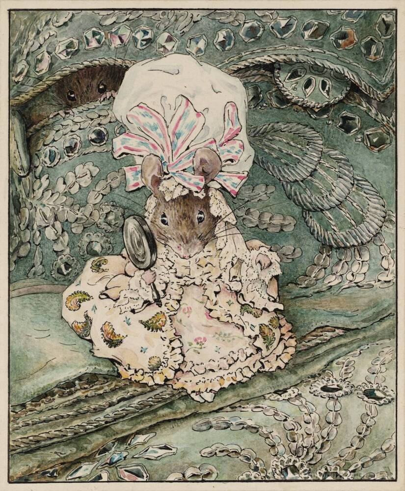 Ti offriamo una riproduzione artigianale su tela dell'opera famosa 'Lady Mouse in Mob Cap' di Beatrix Potter, dal Museo delle Riproduzioni.