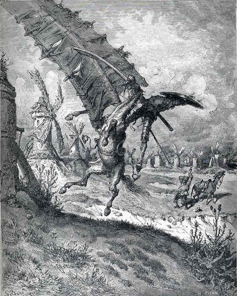 Ti offriamo una riproduzione artigianale su tela dell'opera famosa 'L'avventura con i mulini a vento' di Gustave Dore, dal Museo delle Riproduzioni.