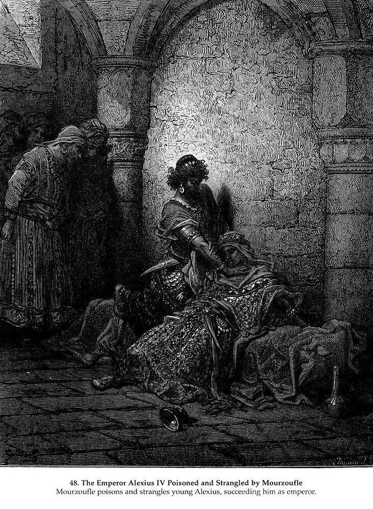 Ti offriamo una riproduzione artigianale su tela dell'opera famosa 'L'imperatore Alessio IV Poisoned e strangolata da Mourzoufle' di Gustave Dore, dal Museo delle Riproduzioni.