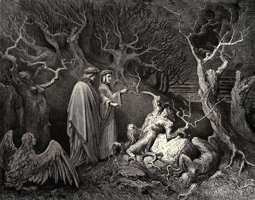 Ti offriamo una riproduzione artigianale su tela dell'opera famosa 'L'Inferno, Canto 13' di Gustave Dore, dal Museo delle Riproduzioni.