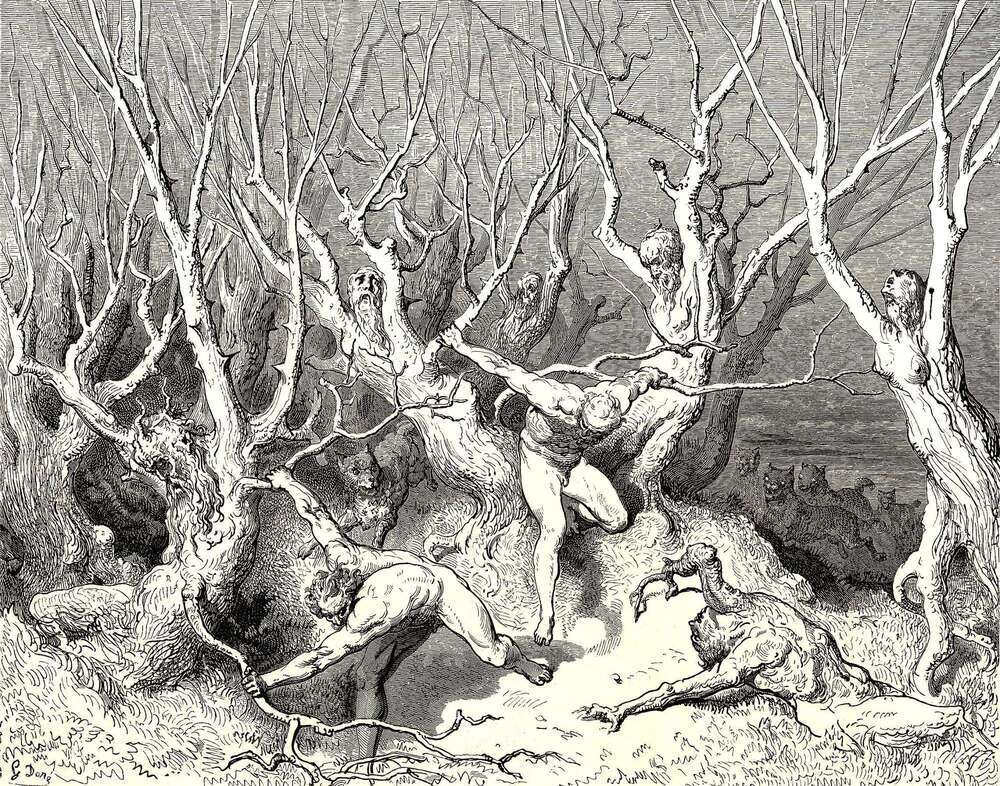 Ti offriamo una riproduzione artigianale su tela dell'opera famosa 'L'Inferno, Canto 13' di Gustave Dore, dal Museo delle Riproduzioni.