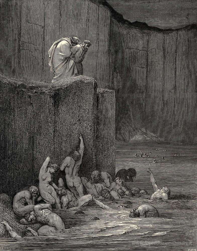 Ti offriamo una riproduzione artigianale su tela dell'opera famosa 'L'Inferno, Canto 18' di Gustave Dore, dal Museo delle Riproduzioni.