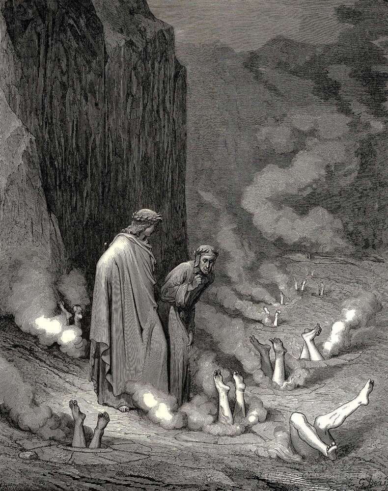Ti offriamo una riproduzione artigianale su tela dell'opera famosa 'L'Inferno, Canto 19' di Gustave Dore, dal Museo delle Riproduzioni.