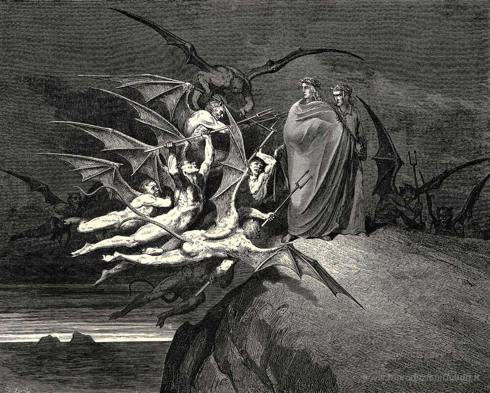 Ti offriamo una riproduzione artigianale su tela dell'opera famosa 'L'Inferno, Canto 21' di Gustave Dore, dal Museo delle Riproduzioni.