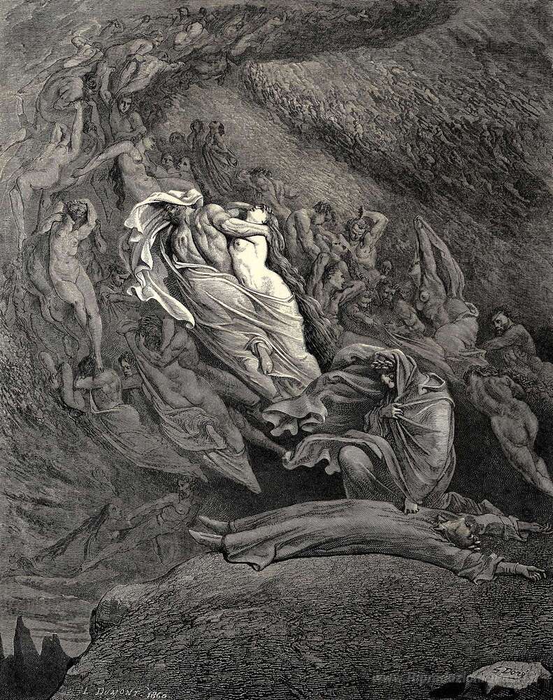 Ti offriamo una riproduzione artigianale su tela dell'opera famosa 'L'Inferno, Canto 5' di Gustave Dore, dal Museo delle Riproduzioni.