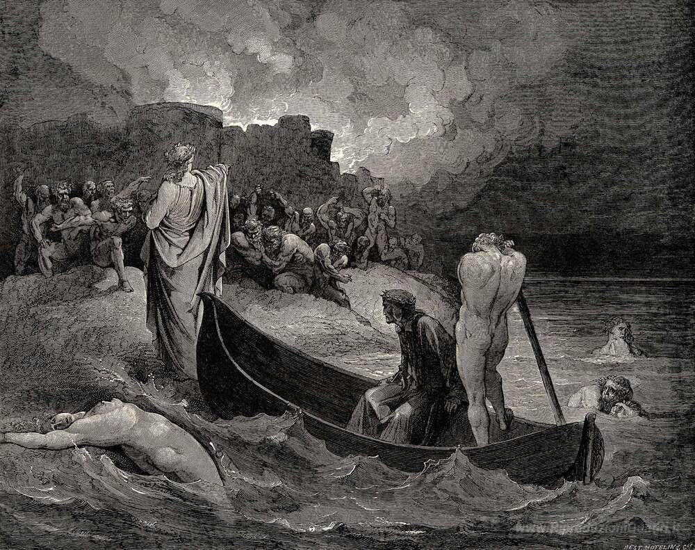 Ti offriamo una riproduzione artigianale su tela dell'opera famosa 'L'Inferno, Canto 8' di Gustave Dore, dal Museo delle Riproduzioni.