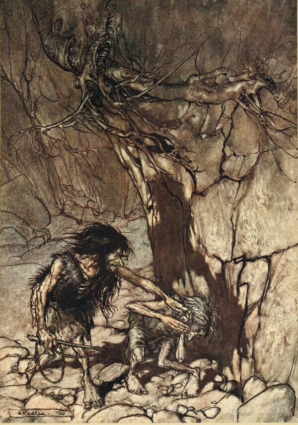 Ti offriamo una riproduzione artigianale su tela dell'opera famosa 'Mimo, ululando. Ohé! Ohé!' di Arthur Rackham, dal Museo delle Riproduzioni.