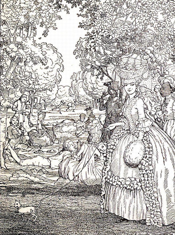 Ti offriamo una riproduzione artigianale su tela dell'opera famosa 'Picnic. Illustrazione per il Libro della marchesa' di Konstantin Somov, dal Museo delle Riproduzioni.