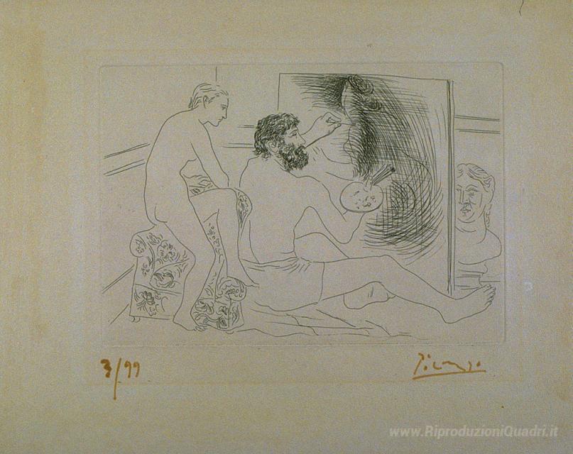 Ti offriamo una riproduzione artigianale su tela dell'opera famosa 'Pittore di lavoro osservato da una modella nuda' di Pablo Picasso, dal Museo delle Riproduzioni.