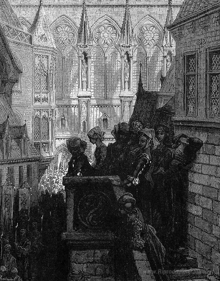 Ti offriamo una riproduzione artigianale su tela dell'opera famosa 'Preghiere per i defunti' di Gustave Dore, dal Museo delle Riproduzioni.