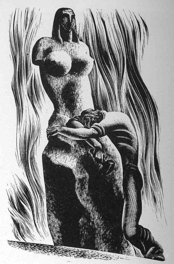 Ti offriamo una riproduzione artigianale su tela dell'opera famosa 'Preludio a un milione di anni' di Lynd Ward, dal Museo delle Riproduzioni.
