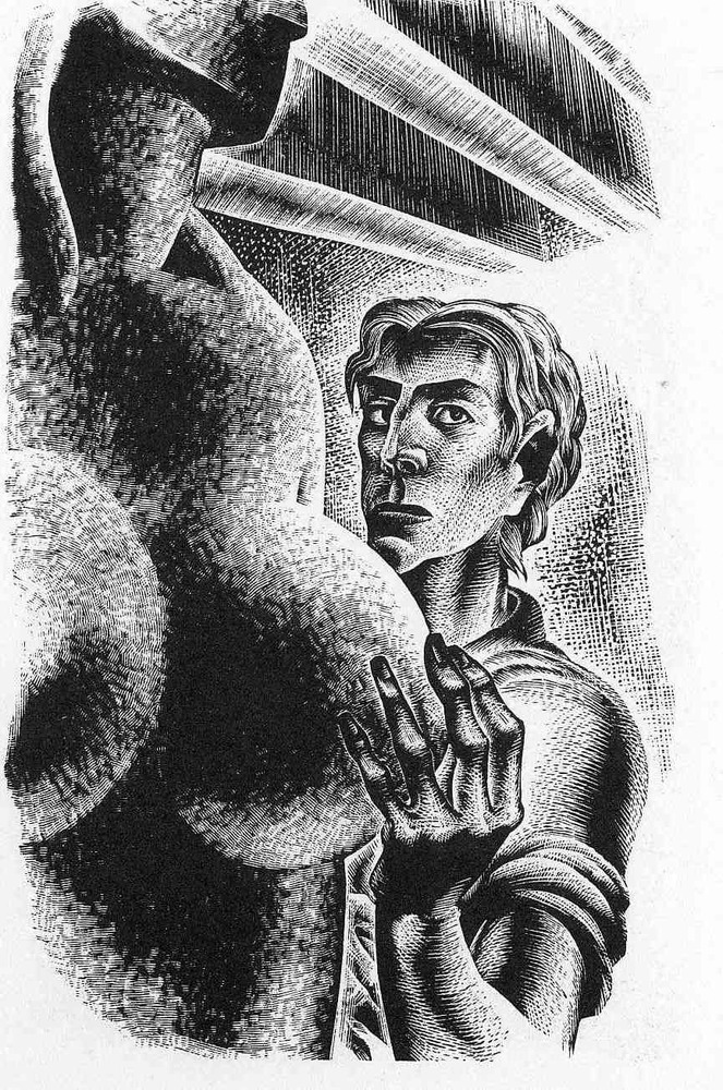 Ti offriamo una riproduzione artigianale su tela dell'opera famosa 'Preludio a un milione di anni' di Lynd Ward, dal Museo delle Riproduzioni.