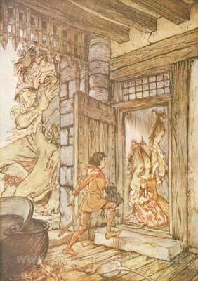 Ti offriamo una riproduzione artigianale su tela dell'opera famosa 'Prendendo le chiavi del castello, Jack aprì tutte le porte' di Arthur Rackham, dal Museo delle Riproduzioni.
