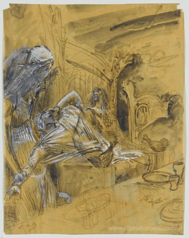 Ti offriamo una riproduzione artigianale su tela dell'opera famosa 'Projet d'illustrazione versare Macbeth- apparizione du spettro à' di Luc-Olivier Merson, dal Museo delle Riproduzioni.