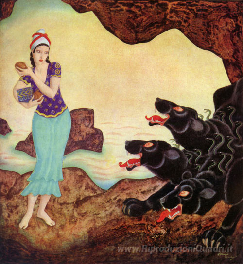 Ti offriamo una riproduzione artigianale su tela dell'opera famosa 'Psiche e Cerberus' di Edmund Dulac, dal Museo delle Riproduzioni.