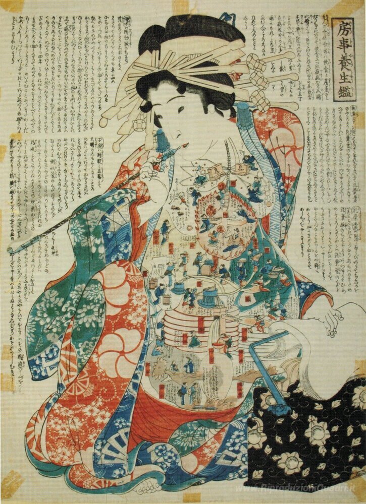 Ti offriamo una riproduzione artigianale su tela dell'opera famosa 'Regole vita sessuale' di Utagawa Kunisada, dal Museo delle Riproduzioni.