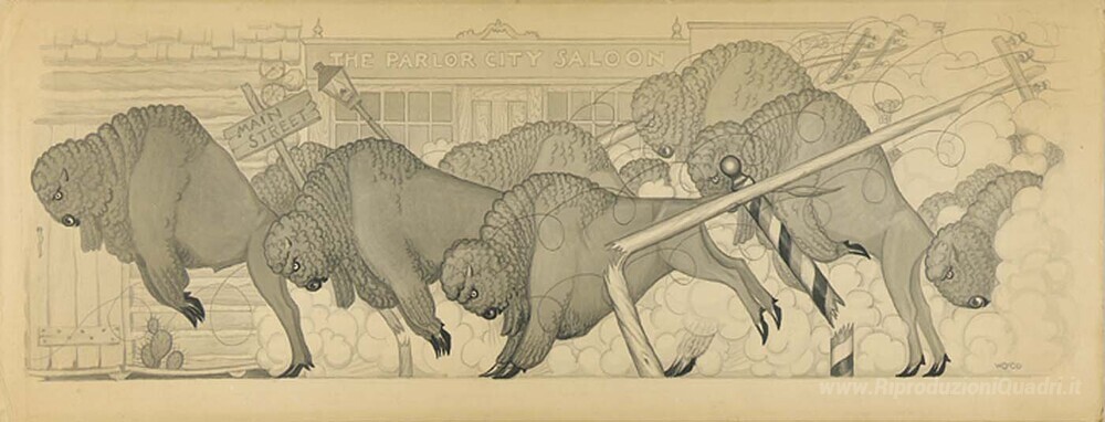 Ti offriamo una riproduzione artigianale su tela dell'opera famosa 'Senza titolo, da privato Savage Iowa (Buffalo Stampede)' di Grant Wood, dal Museo delle Riproduzioni.