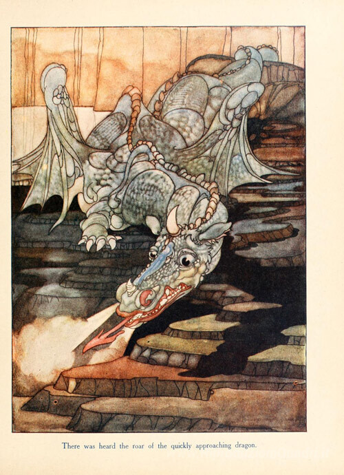 Ti offriamo una riproduzione artigianale su tela dell'opera famosa 'Si udì il rombo del drago rapidamente avvicinando' di Charles Robinson, dal Museo delle Riproduzioni.