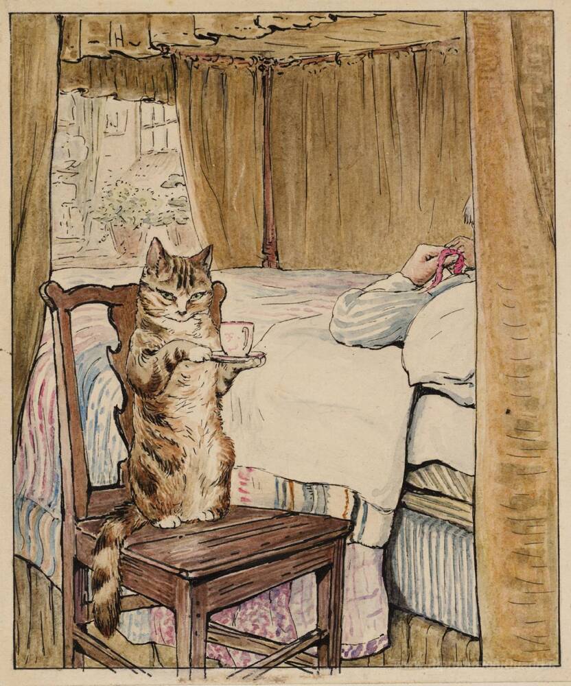 Ti offriamo una riproduzione artigianale su tela dell'opera famosa 'Simpkin al capezzale del sarto' di Beatrix Potter, dal Museo delle Riproduzioni.