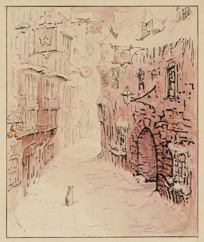 Ti offriamo una riproduzione artigianale su tela dell'opera famosa 'Simpkin nella via dello Snowy' di Beatrix Potter, dal Museo delle Riproduzioni.