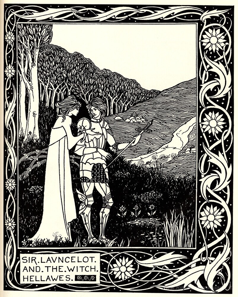 Ti offriamo una riproduzione artigianale su tela dell'opera famosa 'Sir Lancillotto e la Strega Hellawes' di Aubrey Beardsley, dal Museo delle Riproduzioni.