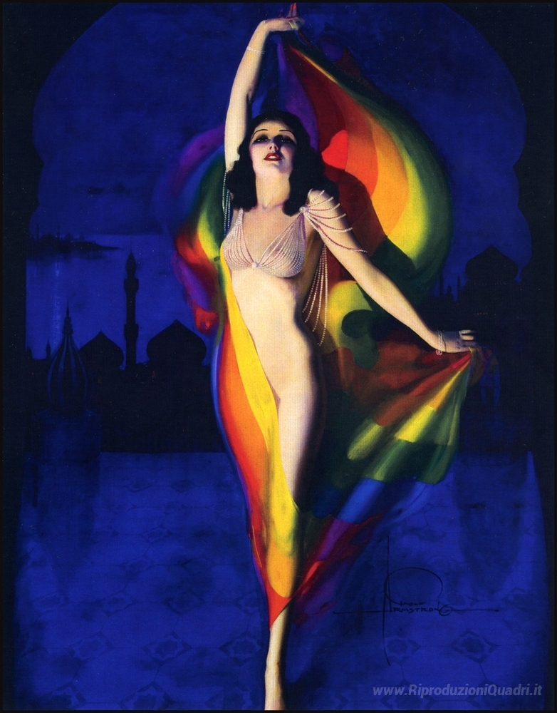 Ti offriamo una riproduzione artigianale su tela dell'opera famosa 'Song of India' di Rolf Amstrong, dal Museo delle Riproduzioni.