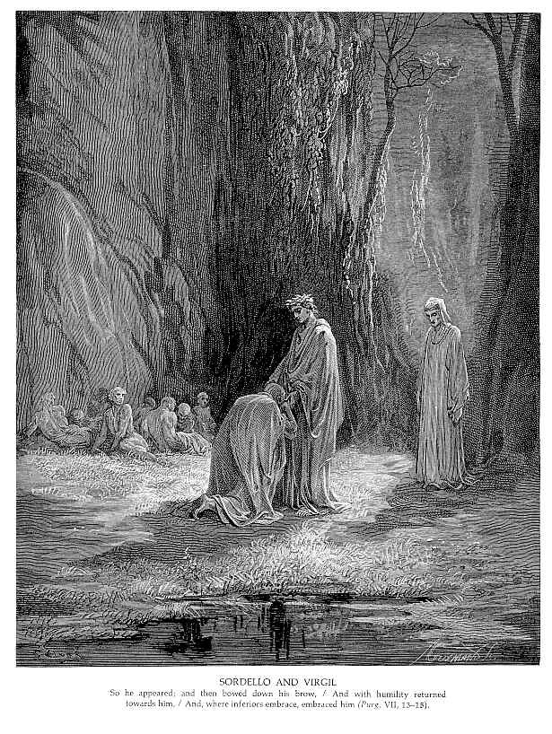 Ti offriamo una riproduzione artigianale su tela dell'opera famosa 'Sordello e Virgilio' di Gustave Dore, dal Museo delle Riproduzioni.
