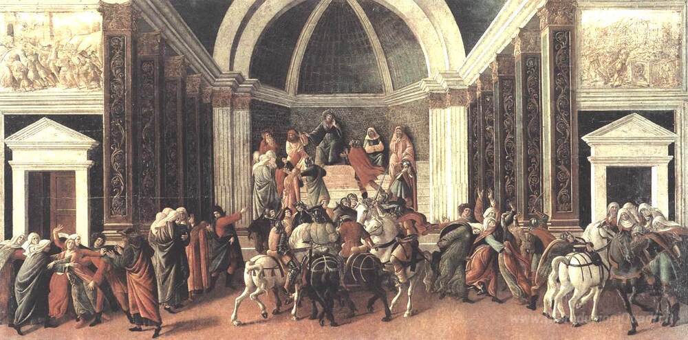 Ti offriamo una riproduzione artigianale su tela dell'opera famosa 'Storia di Virginia' di Sandro Botticelli, dal Museo delle Riproduzioni.
