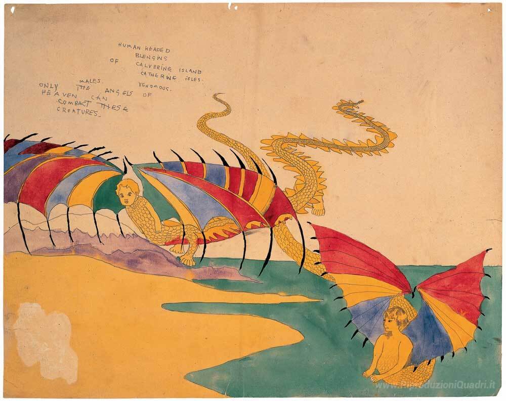 Ti offriamo una riproduzione artigianale su tela dell'opera famosa 'Testa umana Blengins di Calverine Isola Catherine Isles' di Henry Darger, dal Museo delle Riproduzioni.