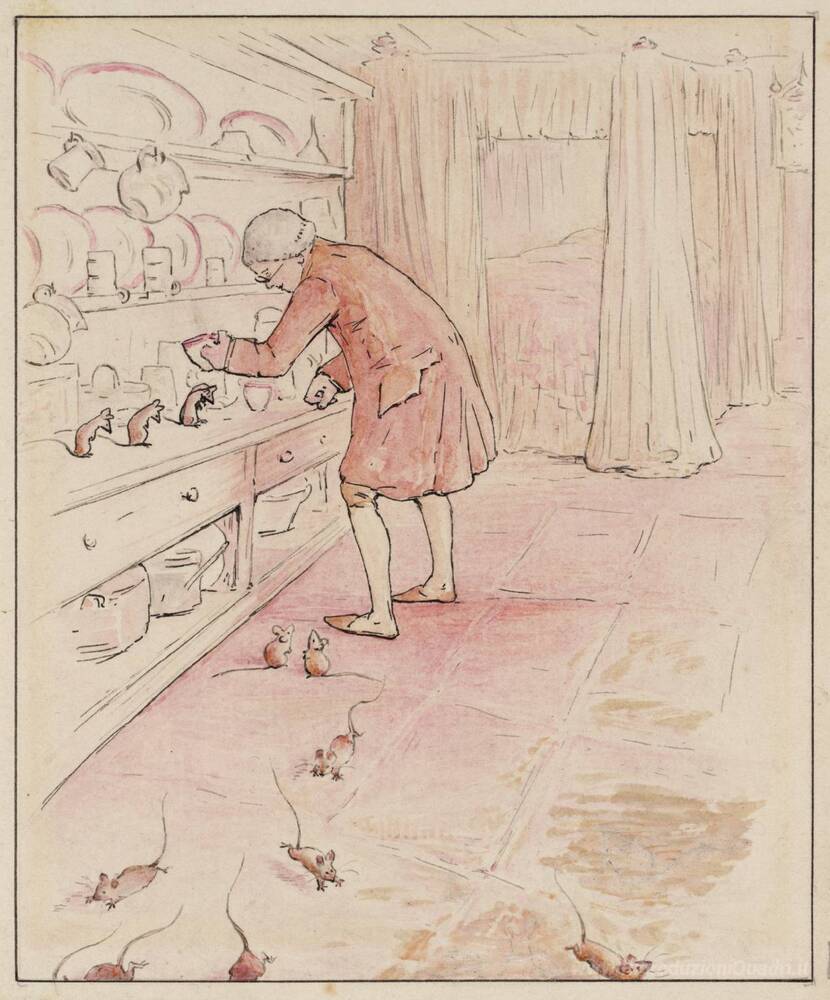 Ti offriamo una riproduzione artigianale su tela dell'opera famosa 'The Escape Mice' di Beatrix Potter, dal Museo delle Riproduzioni.