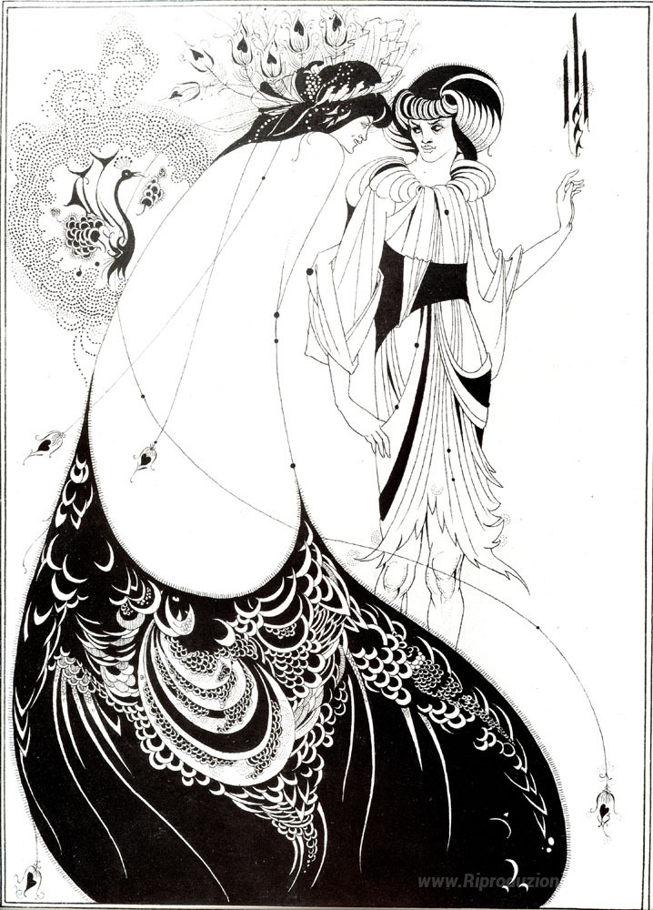 Ti offriamo una riproduzione artigianale su tela dell'opera famosa 'The Peacock Skirt' di Aubrey Beardsley, dal Museo delle Riproduzioni.