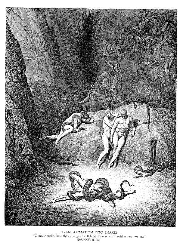 Ti offriamo una riproduzione artigianale su tela dell'opera famosa 'Trasformazione in Snakes' di Gustave Dore, dal Museo delle Riproduzioni.