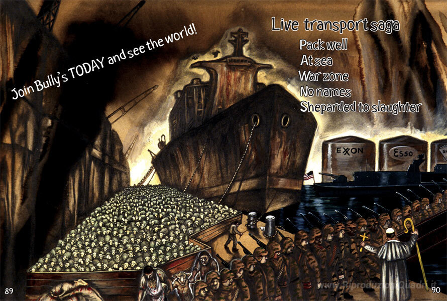 Ti offriamo una riproduzione artigianale su tela dell'opera famosa 'Trasporto' di Sue Coe, dal Museo delle Riproduzioni.