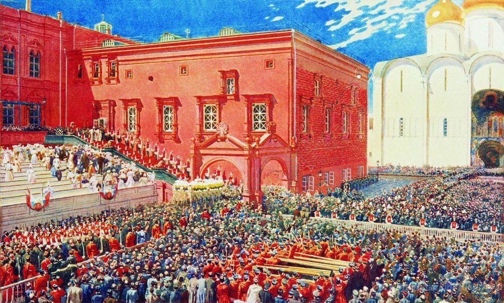 Ti offriamo una riproduzione artigianale su tela dell'opera famosa 'Un arco con un portico rosso. Illustrazione per l'album incorona' di Andrei Ryabushkin, dal Museo delle Riproduzioni.