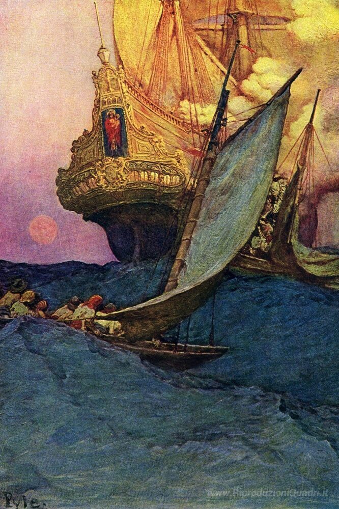Ti offriamo una riproduzione artigianale su tela dell'opera famosa 'Un attacco a un galeone' di Howard Pyle, dal Museo delle Riproduzioni.