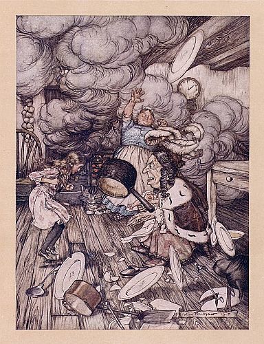 Ti offriamo una riproduzione artigianale su tela dell'opera famosa 'Un insolitamente grande casseruola volò vicino, e quasi portato ' di Arthur Rackham, dal Museo delle Riproduzioni.