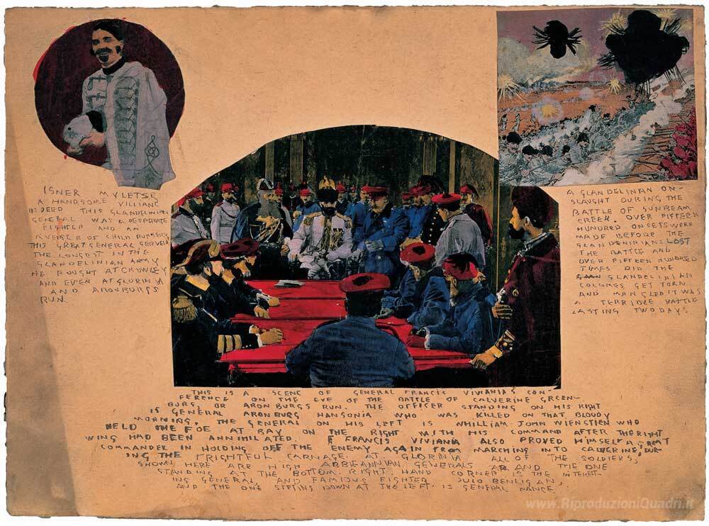 Ti offriamo una riproduzione artigianale su tela dell'opera famosa 'Untitled (Ritratti di Glandelinian e High Abbieannian Generals)' di Henry Darger, dal Museo delle Riproduzioni.
