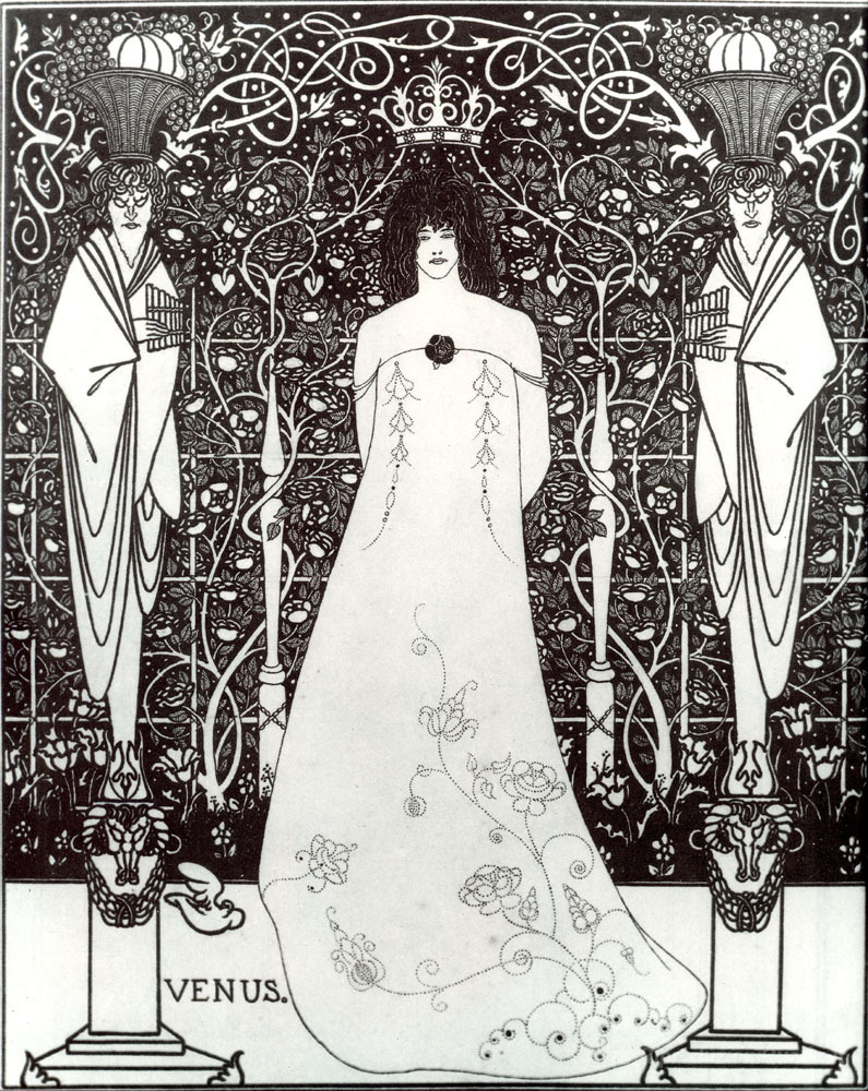 Scopri l'incanto di Venere tra il Terminal Gods, un'opera straordinaria dell'artista britannico Aubrey Beardsley, noto per il suo stile distintivo che fonde estetica e simbolismo. Beardsley, attivo nella fine del XIX secolo, è celebre per i suoi disegni intricati e audaci, caratterizzati da un uso sapiente dell'inchiostro e da un'influenza giapponese che traspare nei dettagli raffinati e nei contrasti tra luce e ombra.