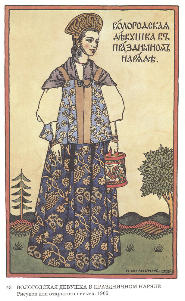 Ti offriamo una riproduzione artigianale su tela dell'opera famosa 'Vologda ragazza in vestito da festa' di Ivan Bilibin, dal Museo delle Riproduzioni.