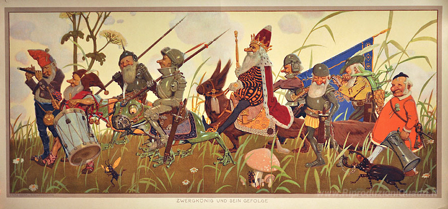 Ti offriamo una riproduzione artigianale su tela dell'opera famosa 'Zwergk?nig und sein Gefolge' di Fritz Rehm, dal Museo delle Riproduzioni.