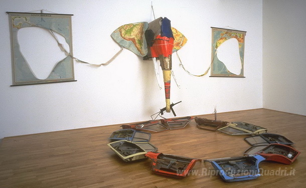 Ti offriamo una riproduzione artigianale su tela dell'opera famosa 'Elefante' di Bill Woodrow, dal Museo delle Riproduzioni.