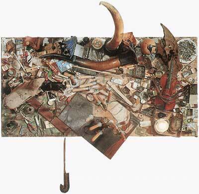 Ti offriamo una riproduzione artigianale su tela dell'opera famosa 'Grande tavolo di lavoro (Marcel Duchamp remis en place)' di Daniel Spoerri, dal Museo delle Riproduzioni.